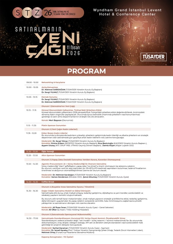 Tedarik zinciri ve satın alma alanında çalışan profesyoneller için yenilikleri takip etme, sektör liderleriyle ağ kurma ve geleceğin iş modellerini keşfetme fırsatı sunan "Satınalmanın Yeni Çağı" temalı bu zirve, değişime öncülük etmek isteyenler için kaçırılmayacak bir etkinlik olacak. Ücretsiz kayıtlar https://tusayder.org adresinden yapılabilecek.
